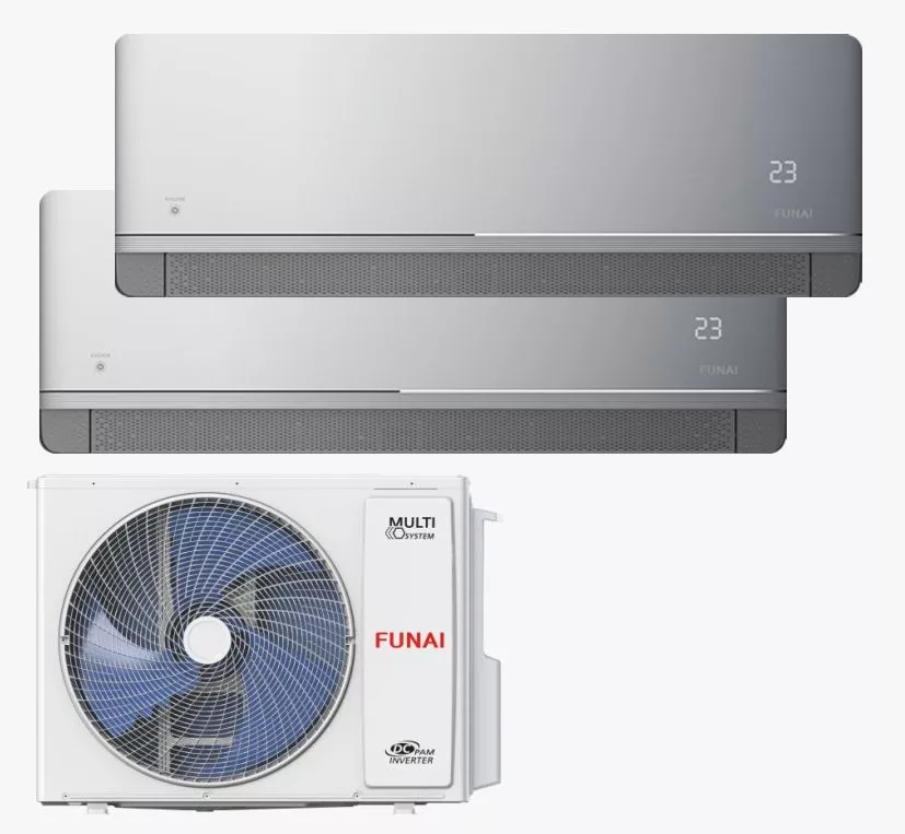 Инверторная мульти сплит-система Funai серии KAGAMI для двух комнат по 20 м² (общая площадь 28-38 м²). Обеспечивает комфортный деликатный обдув (SMART Soft Breeze с перфорированными жалюзи и SMART Air в 4 направлениях), класс энергоэффективности A++ и встроенный Wi-Fi модуль.