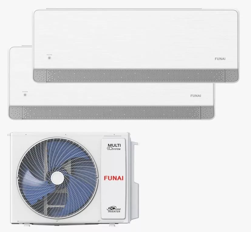 Инверторная мульти сплит-система Funai серии KAGAMI White для помещений 20 м² и 25 м² (общая площадь 38-50 м²). Обеспечивает деликатный обдув (SMART Soft Breeze с перфорированными жалюзи и SMART Air в 4 направлениях), класс энергоэффективности A++ и встроенный Wi-Fi модуль.