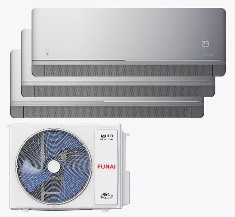 Инверторная мульти сплит-система Funai серии KAGAMI для трех комнат по 25 м² (общая площадь 70-80 м²). Обеспечивает деликатный обдув (SMART Soft Breeze с перфорированными жалюзи и SMART Air в 4 направлениях), класс энергоэффективности A++ и встроенный Wi-Fi модуль.