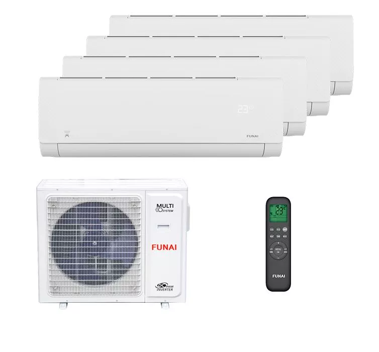 Инверторная мульти сплит-система Funai серии SHOGUN для четырех комнат по 20 м² (общая площадь 70-80 м²). Обеспечивает сверхтихую работу от 19 дБ(А), управление потоком воздуха в 4 направлениях (SMART Air) и встроенный Wi-Fi модуль для удаленного контроля.