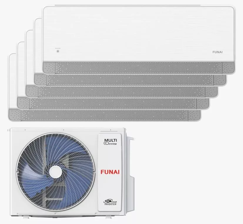 Инверторная мульти сплит-система Funai серии KAGAMI White (RAM-I-KMS30HP.W01/S x5 + RAM-I-5OK120HP.01/U) для пяти комнат по 25 м² (общая площадь 110-140 м²). Обеспечивает деликатный обдув (SMART Soft Breeze с перфорированными жалюзи и SMART Air в 4 направлениях), класс энергоэффективности A++ и встроенный Wi-Fi модуль.